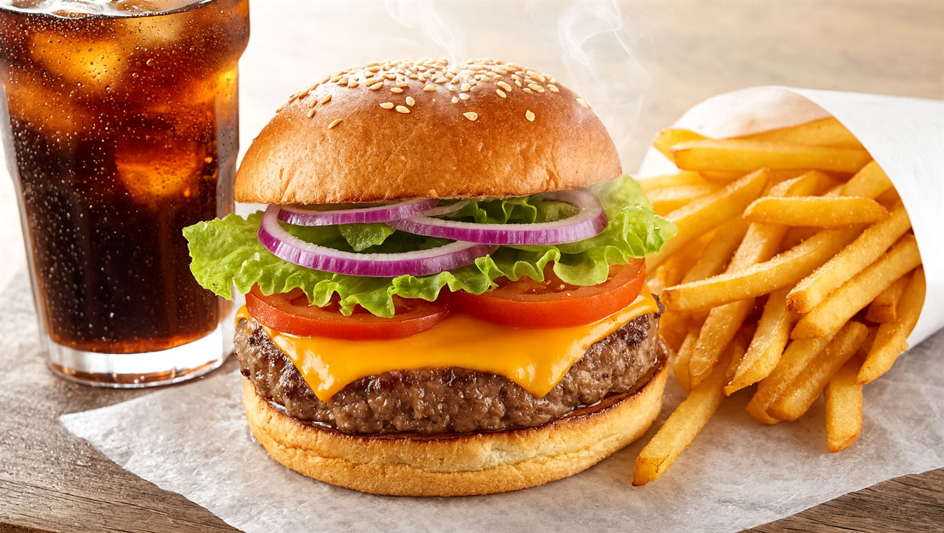 Selecciona tu variedad de burger y el formato de papas fritas que prefieras.