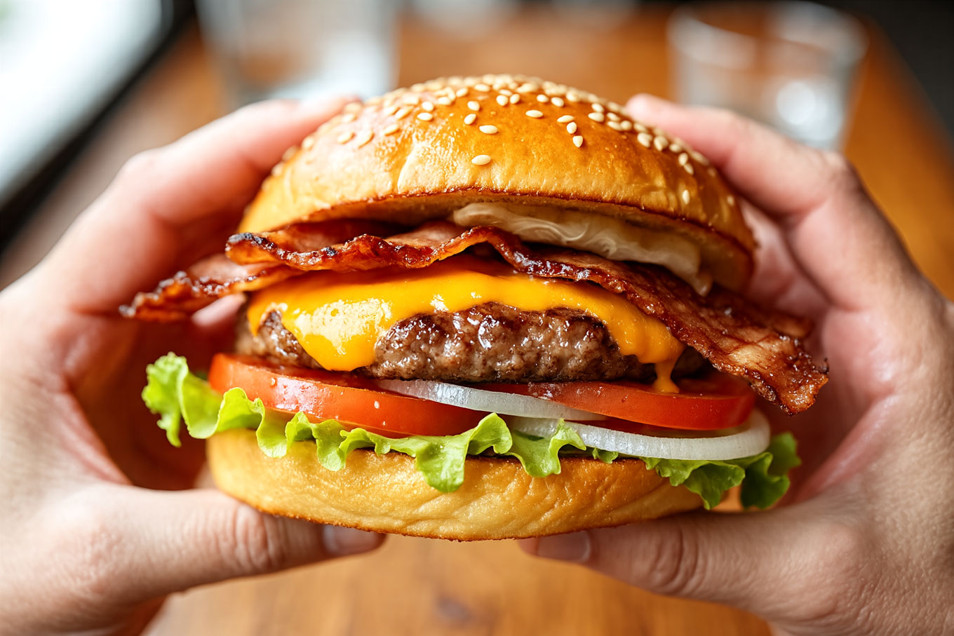 Classic Smash: La esencia de lo auténtico. Carne smash con queso cheddar fundido, tocino crocante, cebolla morada, tomate, lechuga fresca y pepinillos.